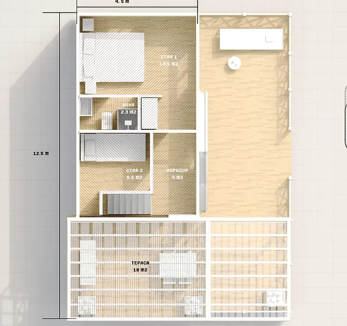 Druhé patro: 4,00 x 11,5 m = 46 m²