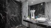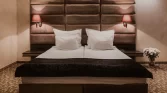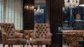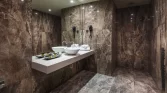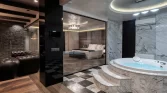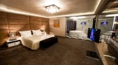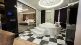 Vynikající design interiéru – podlahy z černého mramoru a žuly, přírodní parkety Marbo, stěny se světlým onyxem a latexem, koupelny s italskými povrchovými úpravami, zlaté a onyxové designové prvky, ložnice a obývací pokoj – designové vybavení italským nábytkem. Plně vybavená kuchyně se spotřebiči Gorenje – lednice, sporák, varná deska, myčka, mrazák, mikrovlnná trouba. Samostatný prostor pro pračku + sušičku. 52 televizorů a zapuštěné osvětlení.
